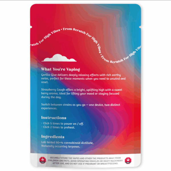Power meets precision in this bold hybrid combo. The Blast Dual Strain 6g Disposable Vape Pen featuring Gorilla Glue and Strawberry Cough is designed for those who want body relaxation without sacrificing clarity or taste.