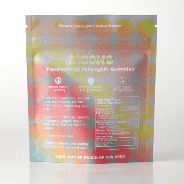 Moons Passionfruit gummies are a tasty and fun way to eat your favorite little mushrooms. Small moon shaped doses that are perfect for sharing.